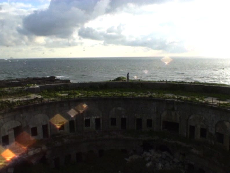 Île du large - Fort désert circulaire - Bivouac de 2 jours - Marche longue de 9 heures sur le périmètre du fort - Film 16mm - Tenue d’un journal de bord.