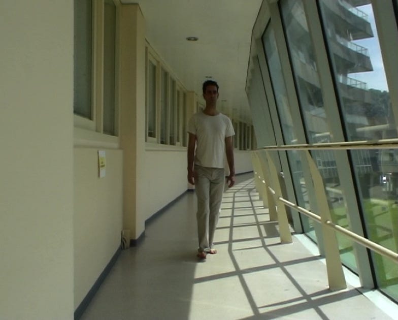 …..L’après midi, premier anneau dans l’hôpital. Sens de la marche: du service consultations externes à médecine D Durée: 2h45 mn. Je marche en privilégiant une avancée constante du centre, les pieds s’adaptant en consequence. Je suis pieds nus, habillé en blanc.Tout en me laissant absorber les évènements extérieurs, je reste visiblement opaque à tout contact, mon regard est périphérique et l’impression globale est celle d’un corps fantomatique.
